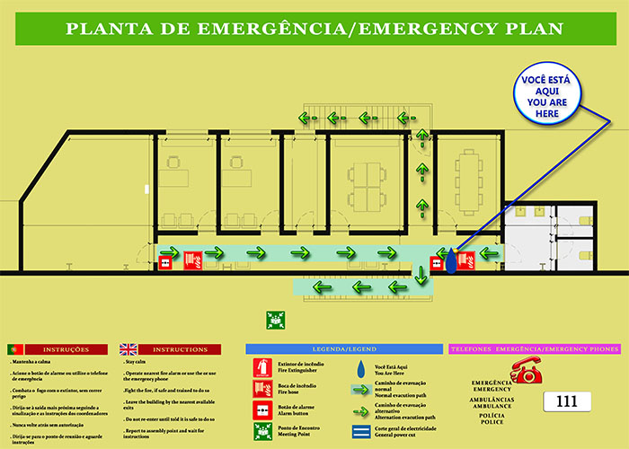 As plantas de emergência representam um elemento essencial e complementar à sinalética de segurança, e devem ser colocadas junto aos acessos principais, todos os pisos do edifício, entradas e saidas, em locais de alto risco e zonas de refúgio, acompanhando as instruções de segurança desses locais...
